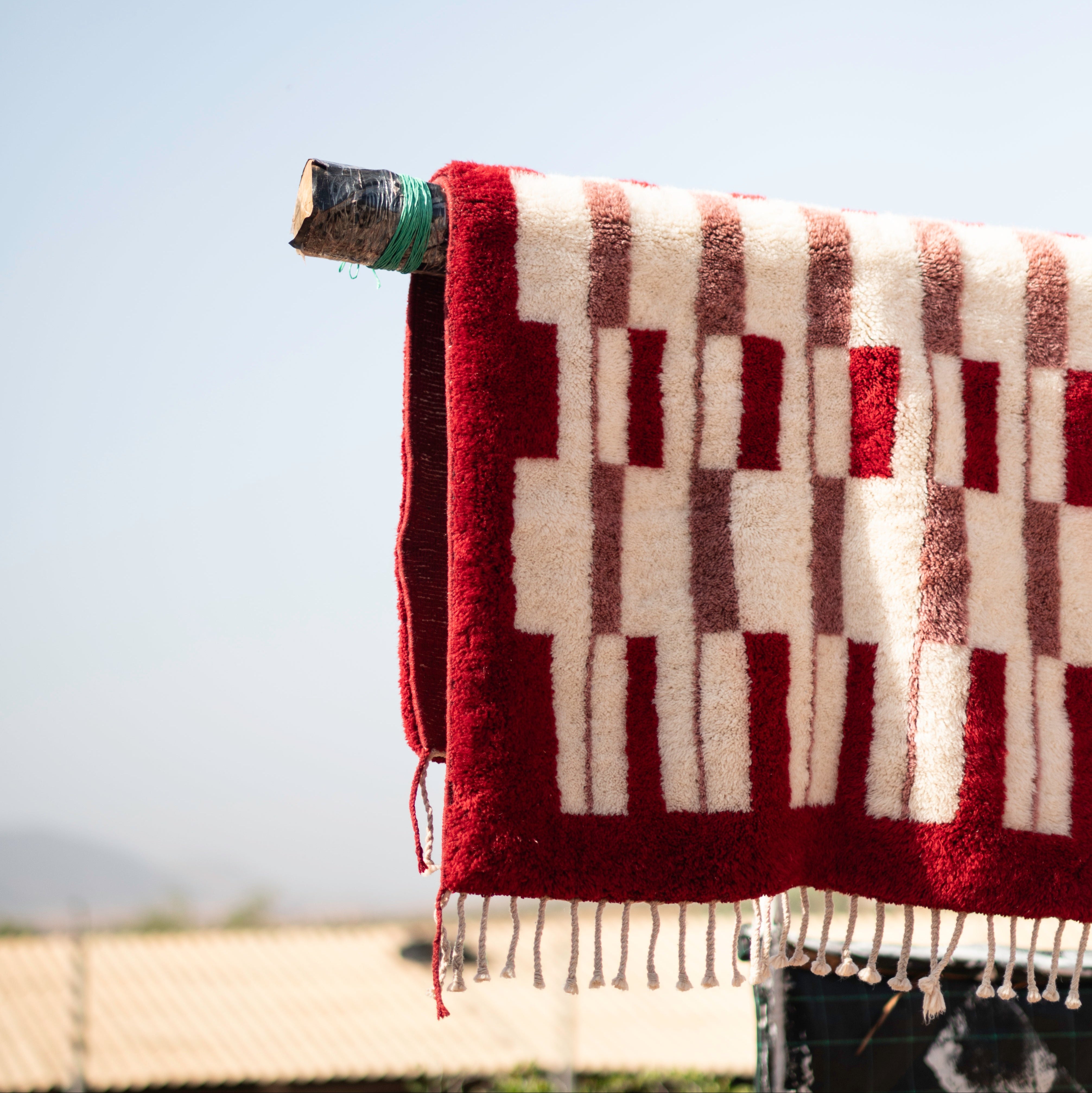 Each rug begins with raw wool, spun, dyed, and knotted by hand in the Atlas Mountains. The process is slow and deliberate, guided by tradition and shaped by the maker’s touch. What emerges is never rushed, never identical; just a rug woven our way, carrying the spirit of where it comes from.